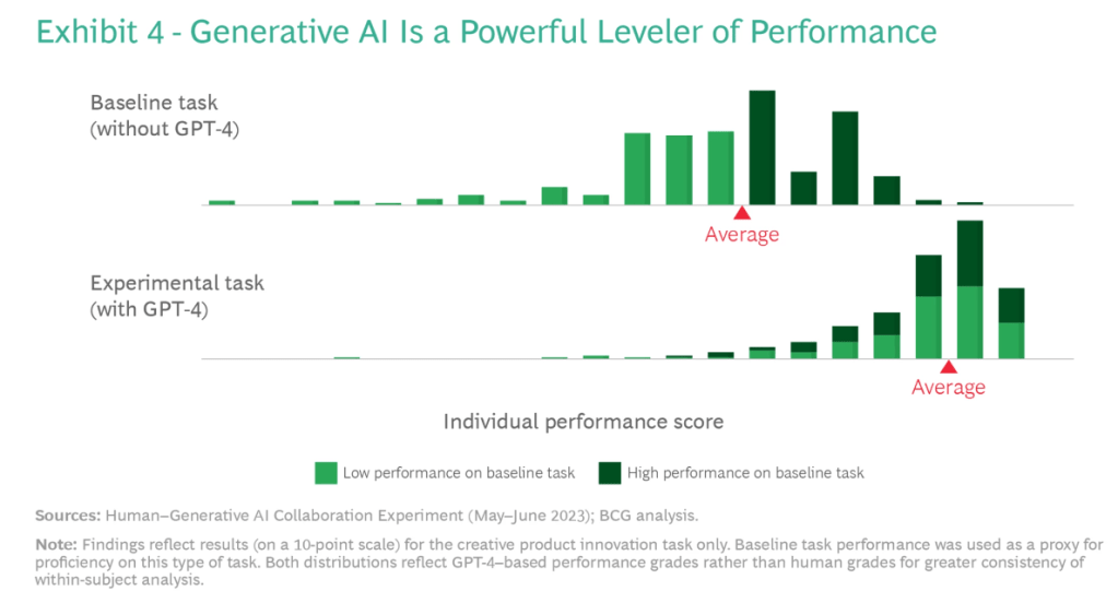 Una de sus principales conclusiones es que al dotarles de herramientas de IA generativa como Chat GPT-4, los empleados más júnior son capaces de demostrar un desempeño muy parecido al de los empleados con mayor experiencia. Mientras que todos ellos se benefician de la utilización de la herramienta, son los que poseen una trayectoria profesional más incipiente los que lo hacen en mayor medida. Las implicaciones en cuanto al impacto en procesos de aprendizaje de las personas que se incorporan a un proyecto son evidentes.
